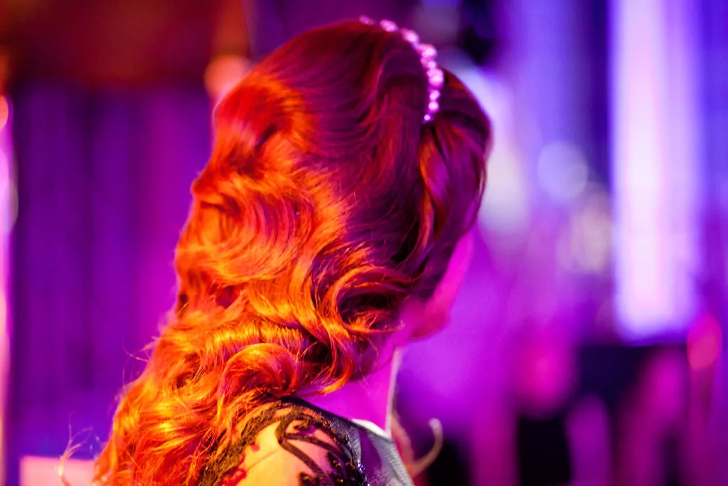 Внутри здания темно и очень фиолетово. Сервированные столы, воздушные шарики, мужчины во фраках, видеооператоры, фотографы и соблазнительно позирующие им женщины в блестящей чешуе. Я, кстати, специально не использовала вспышку, жертвуя репортажным качеством, чтобы вы могли оценить насыщенную палитру этого сюрреалистического пространства.