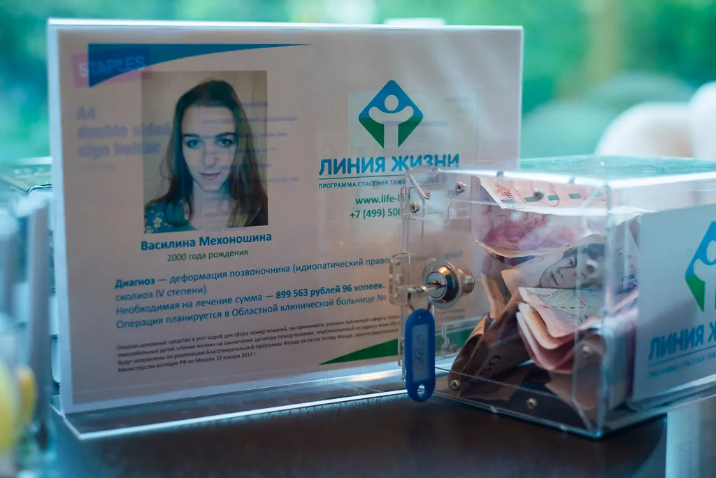 Фонд Chance For Life оплачивает дорогостоящие операции тяжелобольным детям из России и сотрудничает с несколькими российскими организациями, включая фонд «Линия жизни». Как сказала на открытии вечера президент фонда Фаина Захарова, «Линия жизни» на протяжении нескольких лет ежедневно спасает жизнь как минимум одного ребенка: один день — одна жизнь. Вчерашний вечер не стал исключением. Гости, собравшиеся послушать, как Алла Демидова читает рассказы Бунина, смогли собрать сумму, достаточную для оплаты операции 16-летней Василине Мехоношиной, страдающей от тяжелой деформации позвоночника.