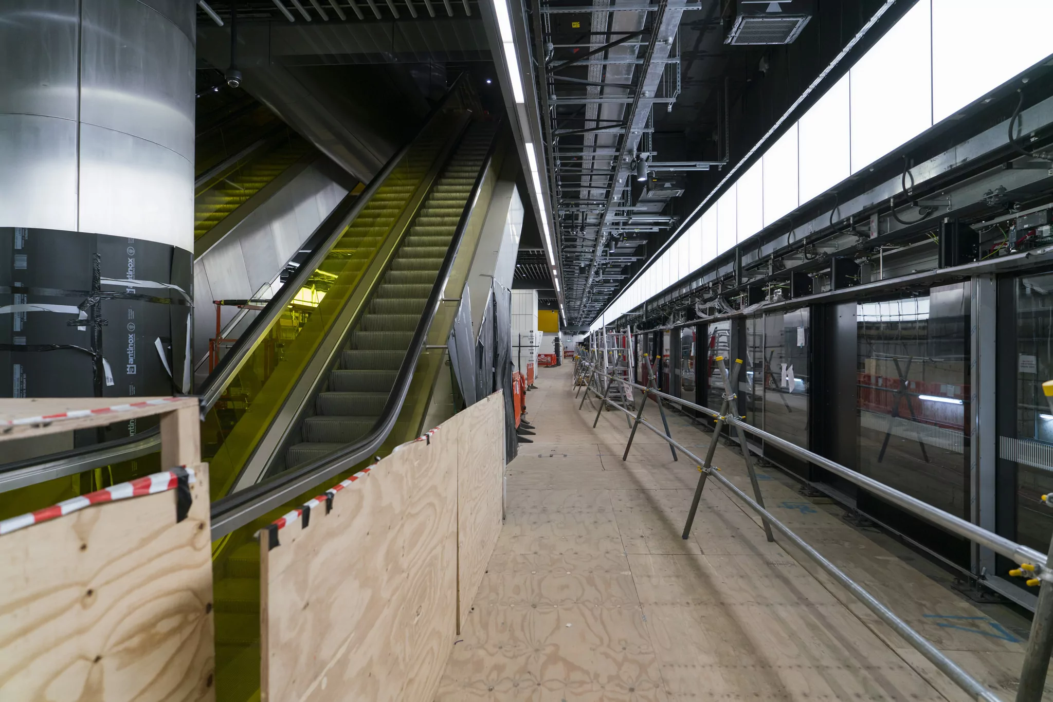 Всех посетителей Liverpool street попросили надеть каски и защитные жилеты, после чего группа спустилась в будущий вестибюль. Здесь уже готов потолок, уникальный своей отделкой, и скоро начнется установка эскалаторов. Позже здесь также будет пробит проход в сторону сегодняшний станции Liverpool Street.
