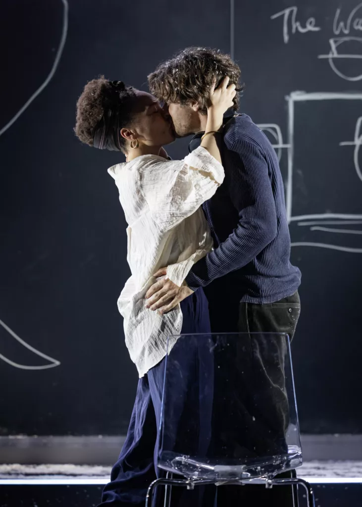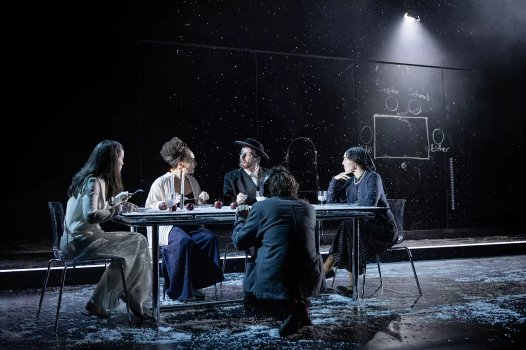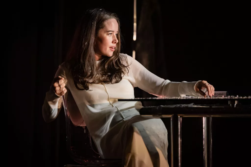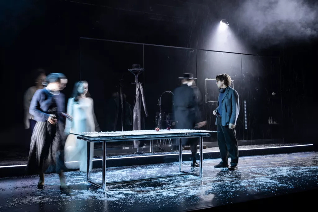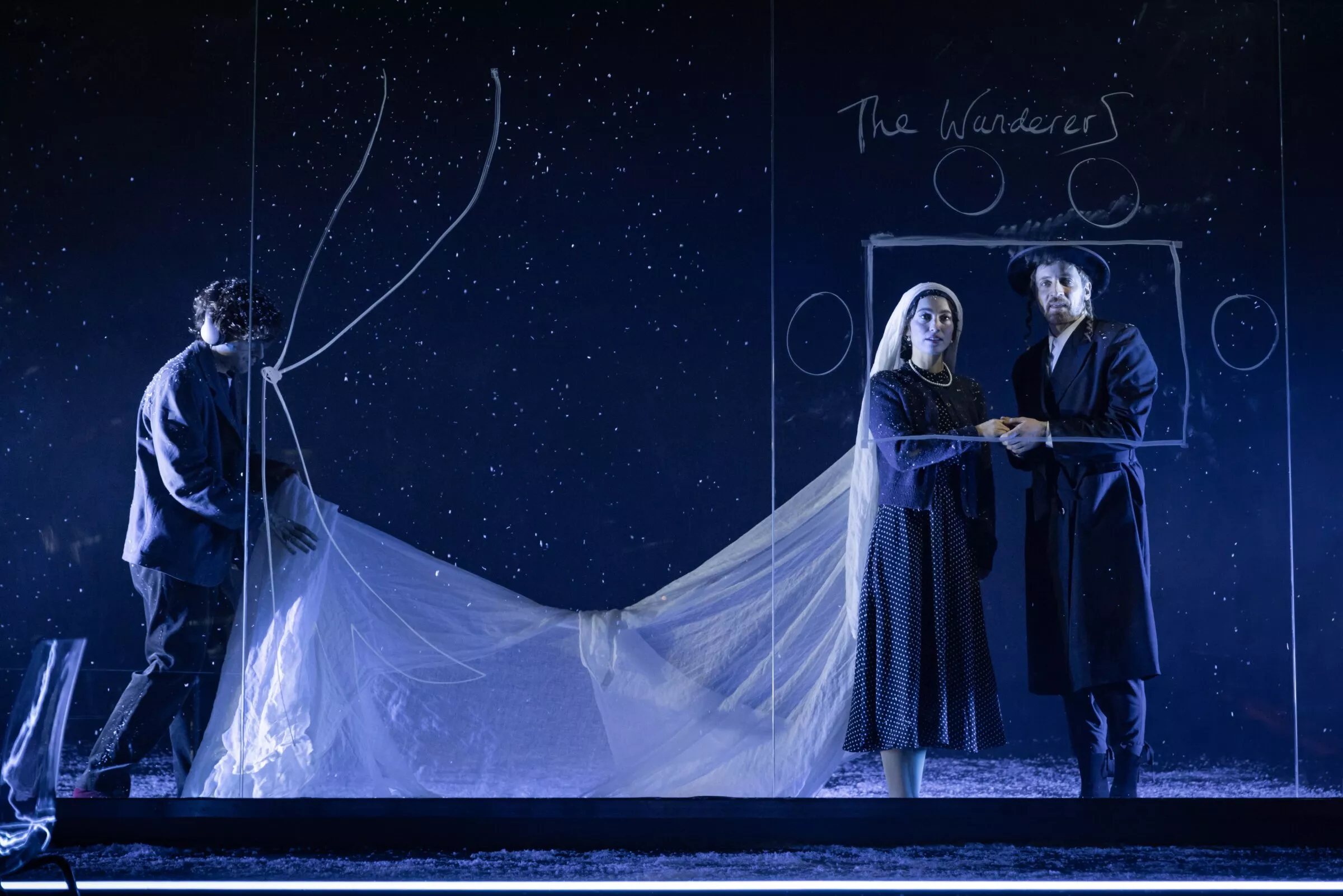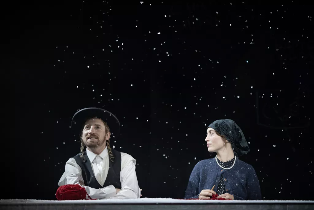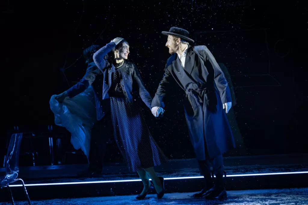 Для поиска ответов Голяк берет пьесу, собравшую охапку профессиональных наград и нахваленную крупными американскими изданиями вроде The Wall Street Journal, минималистичную, но очень трогательную декорацию Яна Паппельбаума, главного сценографа берлинского Schaubühne (в черном сценическом пространстве имеются прозрачное стекло, на котором герои рисуют и пишут белым маркером, прозрачный стол, прозрачные стулья, изредка идущий белый снег и полупрозрачная белая ткань, которая служит и фатой невесты, и детскими пеленками, и скатертью для семейных ужинов) и нескольких ярких артистов. Среди них, например, есть Анна Попплуэлл и Катерина Танненбаум. Первую вы можете вспомнить совсем юной в «Хрониках Нарнии», а вторая играла в сериале And Just Like That — провалившемся недавнем продолжении «Секса в большом городе».