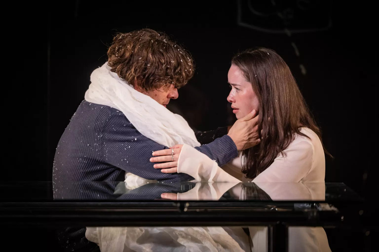 Для поиска ответов Голяк берет пьесу, собравшую охапку профессиональных наград и нахваленную крупными американскими изданиями вроде The Wall Street Journal, минималистичную, но очень трогательную декорацию Яна Паппельбаума, главного сценографа берлинского Schaubühne (в черном сценическом пространстве имеются прозрачное стекло, на котором герои рисуют и пишут белым маркером, прозрачный стол, прозрачные стулья, изредка идущий белый снег и полупрозрачная белая ткань, которая служит и фатой невесты, и детскими пеленками, и скатертью для семейных ужинов) и нескольких ярких артистов. Среди них, например, есть Анна Попплуэлл и Катерина Танненбаум. Первую вы можете вспомнить совсем юной в «Хрониках Нарнии», а вторая играла в сериале And Just Like That — провалившемся недавнем продолжении «Секса в большом городе».