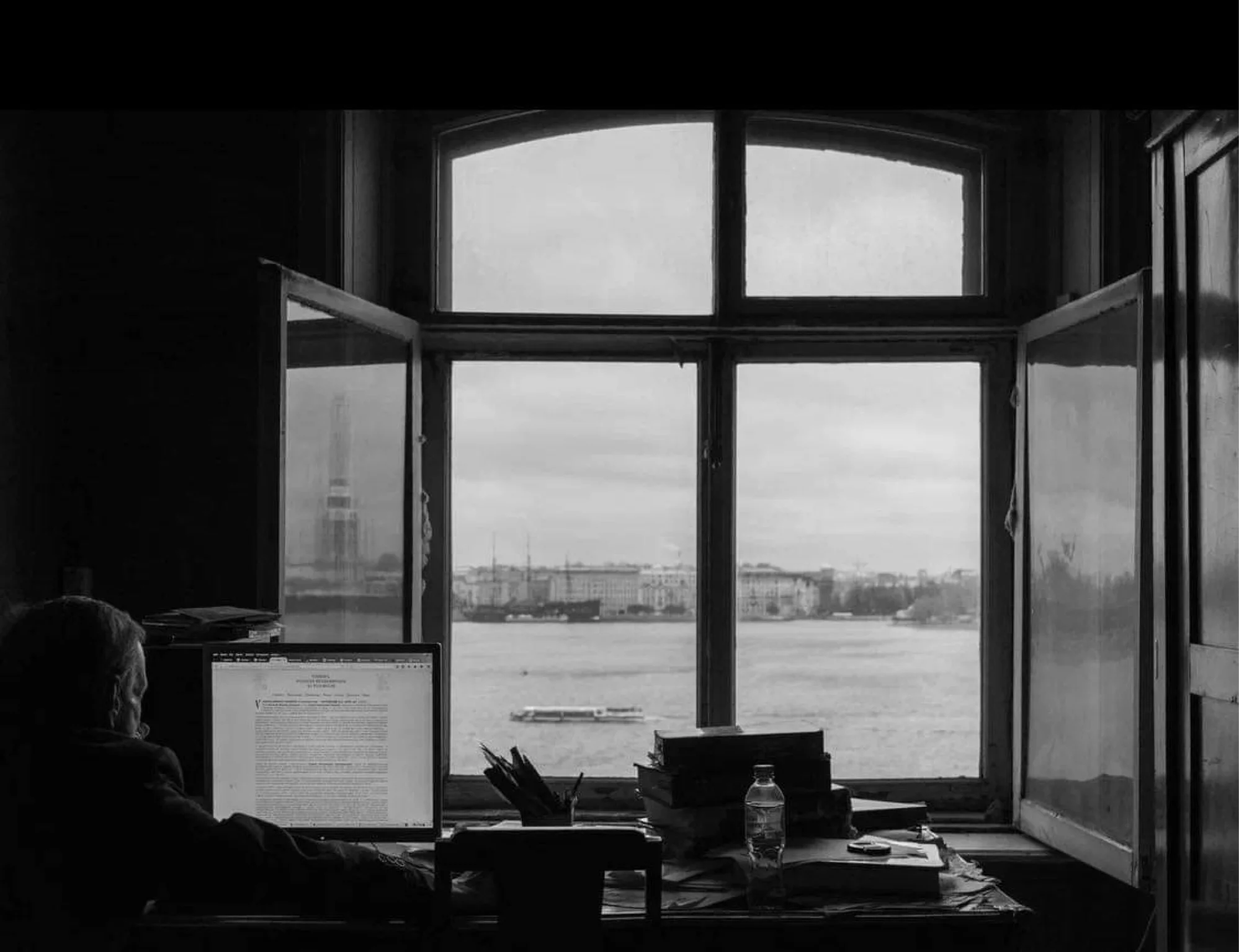 По экрану проплывали облака и тучи, возникали роскошные дворцы и рушились древние царства, мор и хлад подступали к священным стенам возлюбленного города, и тут же отступали с торжественной мерностью морских приливов и отливов. Нашлось в этой инсталляции и место самому герою выставки Аркадию Ипполитову. Он сидел, повернувшись к нам спиной перед своим старым эрмитажным компьютером, в котором, стремительно сменяя друг друга, появлялись его тексты. А над всем этим, пронзая небо, парил петропавловский шпиль с ангелом на вершине, и небесный чистоты голос с шубертовским отчаянием взывал о чем-то у намертво закрытых Царских Врат. О чем?