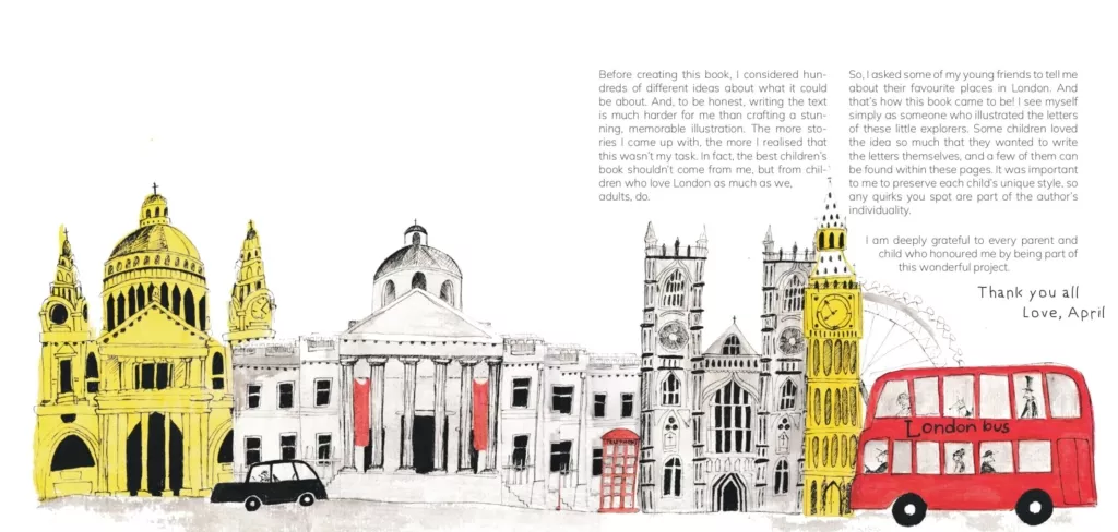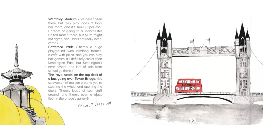 Один из самых ее примечательных книжных проектов — «Лондон глазами детей», где она собрала истории маленьких лондонцев и проиллюстрировала их своими рисунками. Получилась прелестная черно-белая серия видов, зарисовок, летучих графических набросков вперемежку с изысканной каллиграфией. Прекрасный, кстати, новогодний подарок.