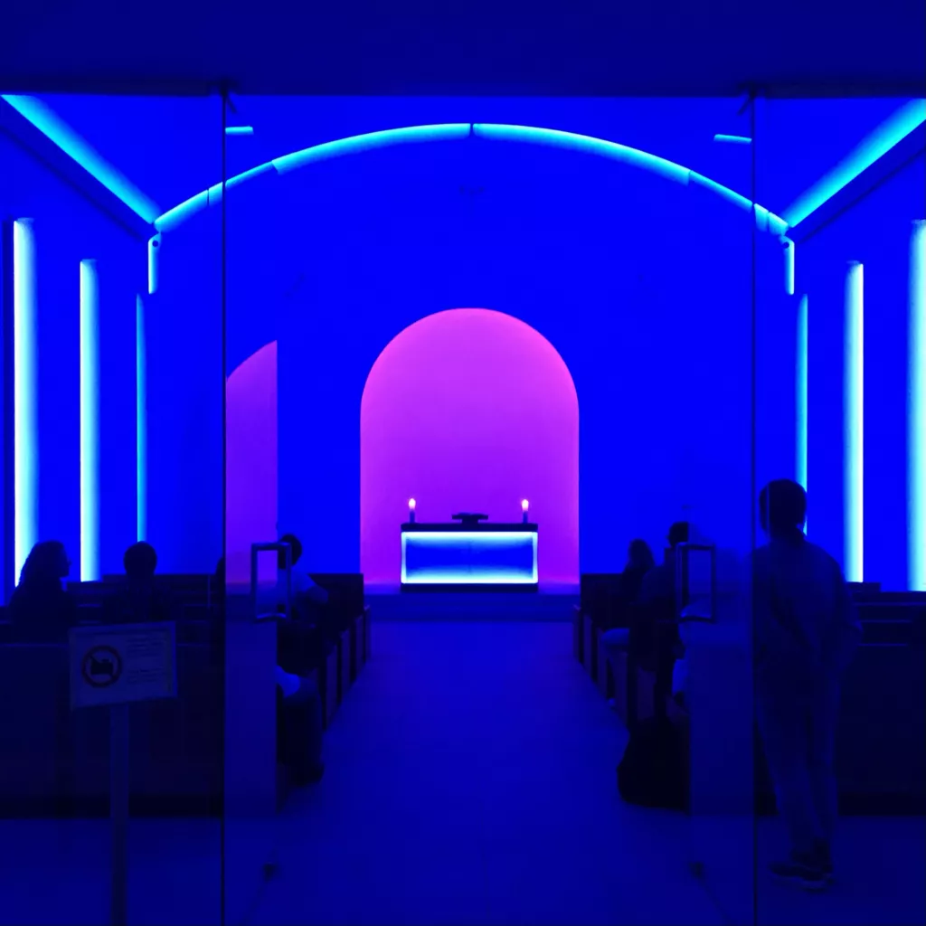 В интерьере нет ни статуй, ни картин, лишь голые стены, которые переливаются всеми мыслимыми цветами, да алтарь со свечами и раскрытой Библией. В центре духовного опыта здесь оказывается книга: идеальная иллюстрация протестантской культуры. Инсталляцию включают только для экскурсионных групп, записаться можно здесь. Туры, как и в бункере Бороса, проводят по-немецки и по-английски; сама экскурсия длится недолго — потом вам дадут время, чтобы посидеть в тишине и понаблюдать, как меняется свет. Сеансы всегда проходят на закате — так задумал художник.