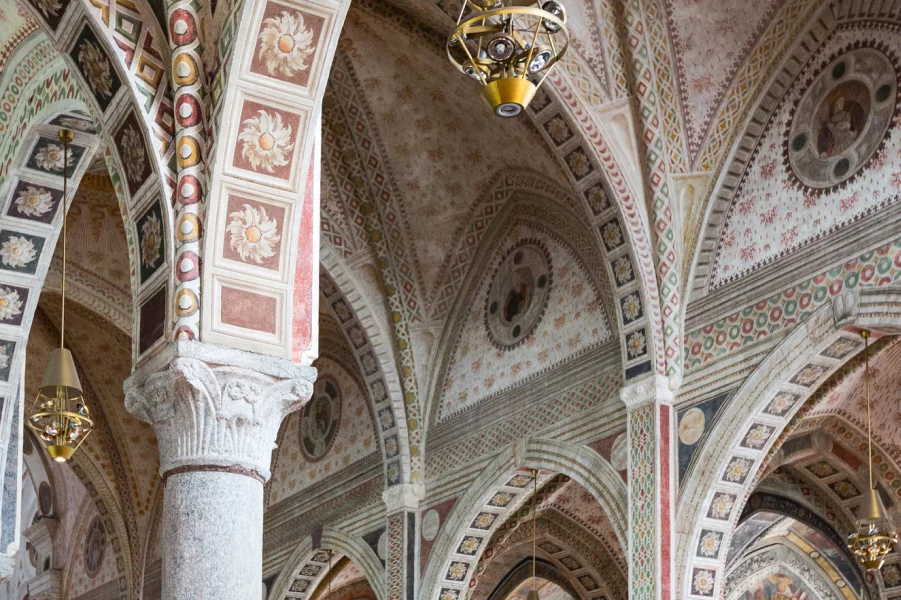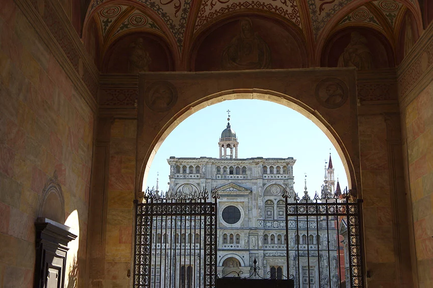 А к югу от Милана есть другое мое любимое место — Павийская обитель, Certosa di Pavia. Висконти, став в 1395 году герцогами, пожелали устроить себе усыпальницу прямо в только что заложенном соборе. Город не позволил, и им пришлось довольствоваться роскошным монастырем молчальников-картузианцев. Этот монастырь — один из лучших образцов пламенеющей готики XV–XVI веков, которую в Италии называют «международной». Подвизавшееся здесь семейство Солари участвовало, кстати, и в украшении Москвы при Иване III.