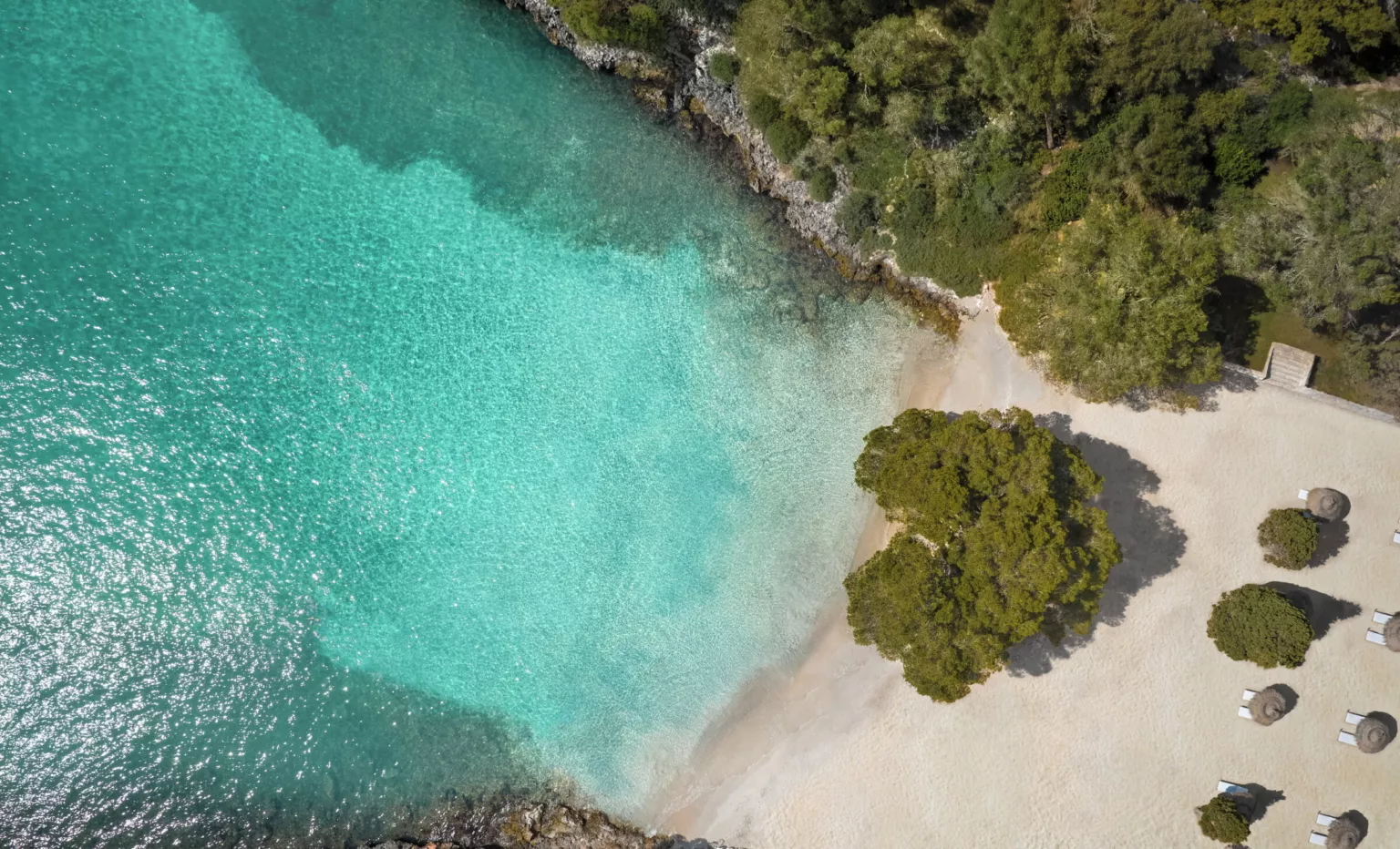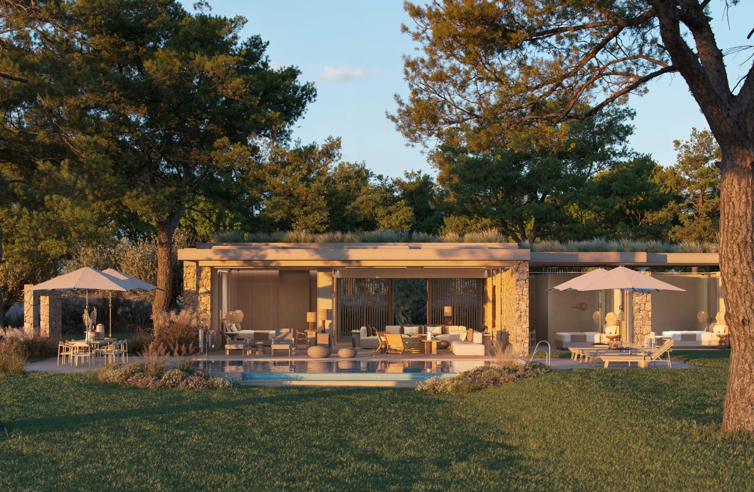 До Майорки Ikos развивался в Греции и Испании – Халкидики, Корфу, Кос, Андалусия – везде, где окружающая среда сама задаёт структуру. С Porto Petro бренд впервые заявил о себе на Балеарских островах, и выбор именно восточного побережья был абсолютно логичным. Это одна из немногих частей острова, где природный ландшафт всё ещё определяет правила застройки. Высотность ограничена, архитектура не должна выдаваться за линию горизонта, а любой новый проект проходит через длинную цепочку экологических согласований. Поэтому Ikos с самого начала проектировали как «горизонтальный курорт»: низкие корпуса вдоль двух бухт, широкие террасы, мягкие линии и фасады, которые скрываются за соснами и выглядят как фрагменты прибрежного рельефа.