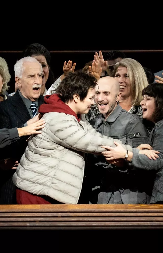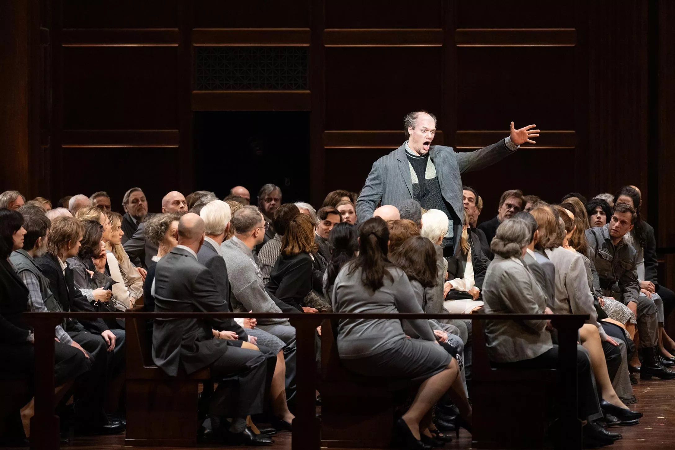 Иоанну на протяжении всей постановки судят не столько судьи и прокуроры, сколько само общество – озлобленное, мстительное, жаждущее крови. Его хор звучит как многоголосая атака, как непрерывные проклятия, превращенные Черняковым в физическую звуковую волну. Даже «голоса свыше», которые слышит Иоанна, воспринимаются не как небесное обращение, а как искаженный шум пропаганды, гул толпы, которой мешают жить такие святые, как она. Настоящий суд Линча – это и есть такая месть большинства. Массовые сцены и акцент на лица свидетелей обвинения — это тоже отголосок и седьмая печать Дрейера в амстердамской опере. Поэтому все выглядело максимально кинематографично (как часто у Чернякова), выделяя крупные планы в ариях. Замечательное сопрано Надежда Павлова была на редкость убедительна в роли фаворитки короля Агнессы Сорель. Как нетрудно было догадаться, прообразом ее героини послужили одновременно нескольких великосветских красавиц, которых легко встретить в антракте в буфете на любой опере в постановке Чернякова.
