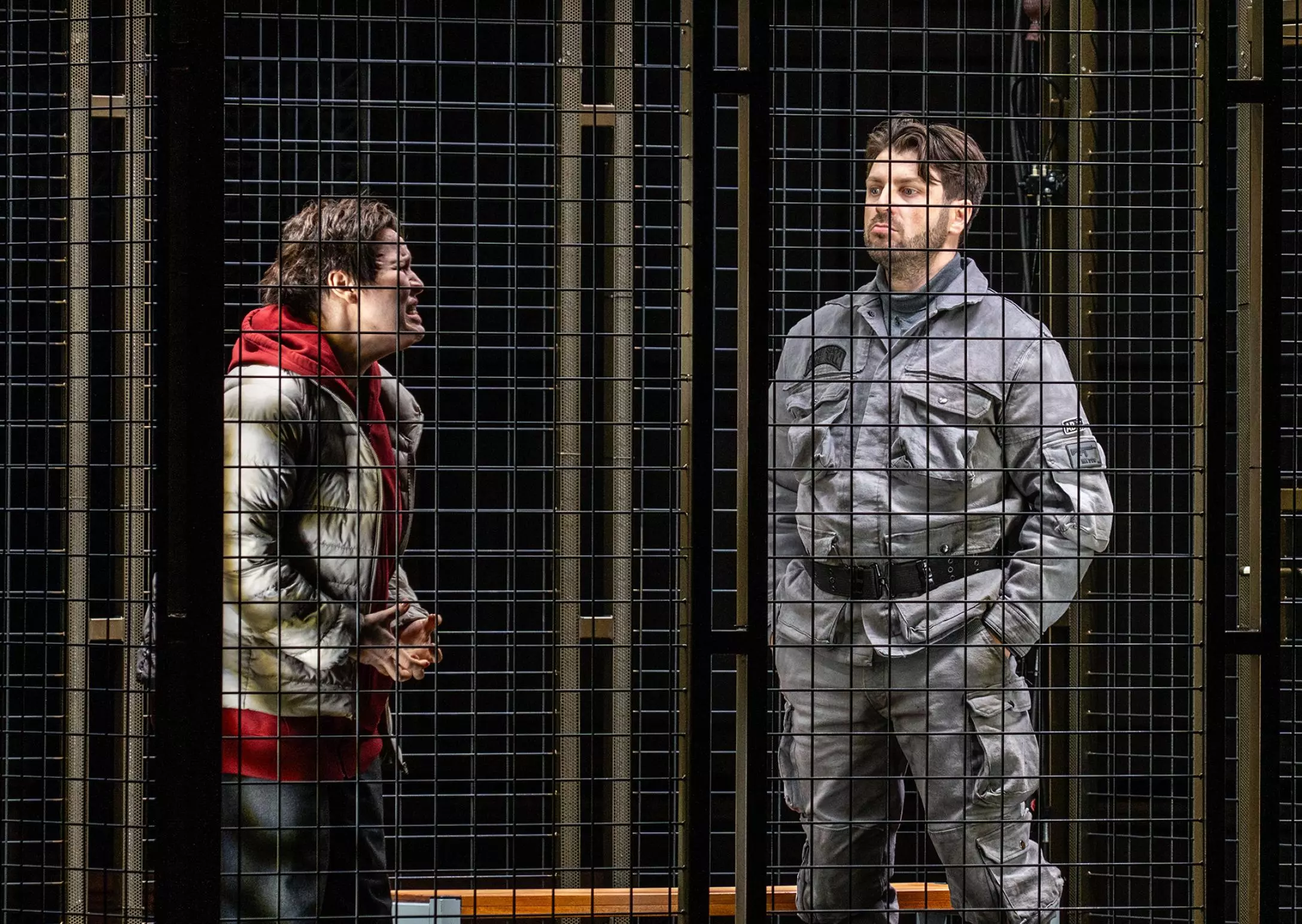Такой же суд мы видели в недавней экранизации «Постороннего» Камю Франсуа Озоном, где судили Мерсо в колониальном Алжире. Но все же меня резануло: на сцене была клетка, до боли знакомый «обезьянник». Интерьеры амстердамской оперы – типично европейские, но и этот легко узнаваемый русский элемент судебного унижения присутствовал, что сразу сменило и угол восприятия.
