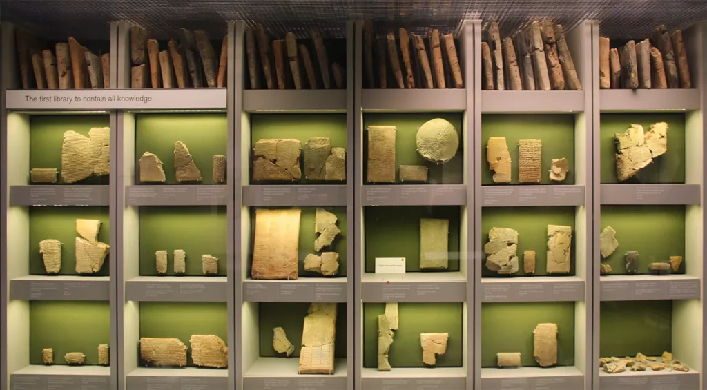 Хотя истоки библиотечных собраний свидетельствуют и о более ранних примерах, первой известной и сохранившейся библиотекой в истории считается Библиотека Ашшурбанипала, созданная в VII веке до н.э. в Ниневии. Это — внушительная коллекция глиняных табличек, которые, в отличие от бумажных книг, не уничтожаются огнем, а потому пережили сжигание города мидийцами и вавилонянами. Этот экспонат мы находим в одном из двух залов, посвященных Двуречью (Месопотамии), колыбели цивилизации. «Нам совершенно не интересен этот царь, — говорит Тамара Эйдельман о том, кто собрал библиотеку — он писал о себе ужасные вещи. Но благодаря нему сохранилась история, которая позже влияла, например, на Бродского».