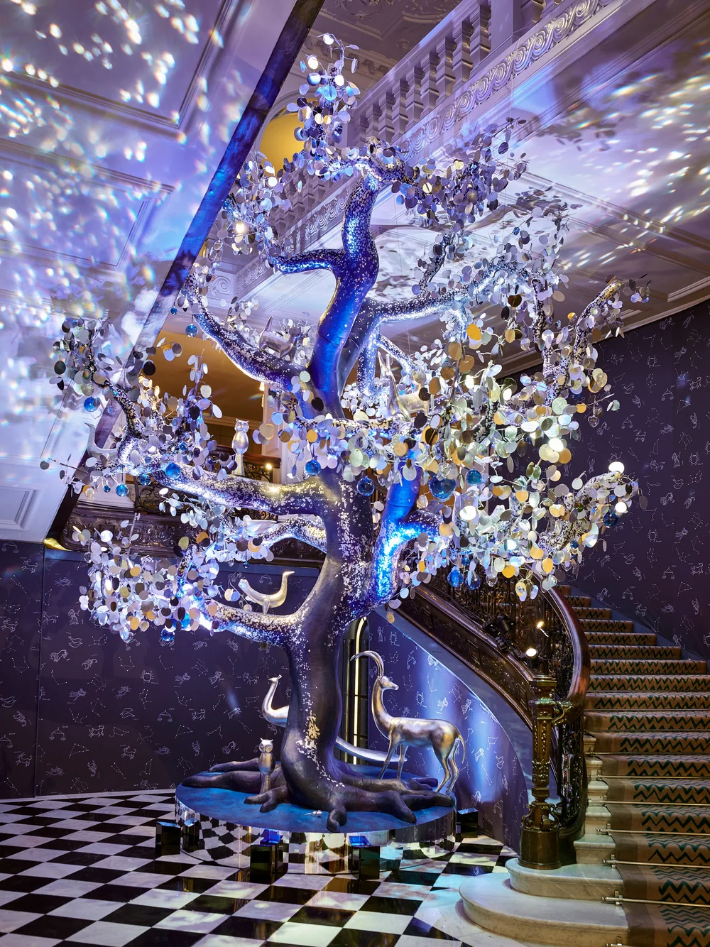 В 2013 и 2014 годах Claridge’s доверил ёлку Dolce & Gabbana. Оба проекта были связаны с сицилийской эстетикой бренда, но различались по масштабу: в 2013 году дерево было относительно компактным, с акцентом на ручную роспись и ремесленные элементы, а в 2014-м вестибюль заняла восьмиметровая инсталляция, насыщенная сотнями стеклянных шаров и миниатюрными сценами сельской жизни – один из самых запоминающихся проектов.
