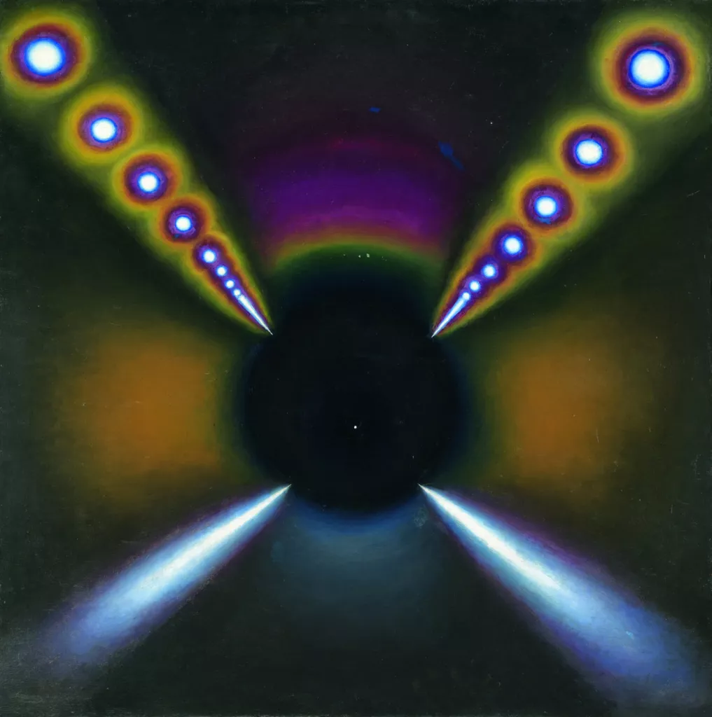 Булатов считает своей творческой целью использовать сразу оба типа картинного пространства. По теории Фаворского — это невозможно, но его ученик принимает вызов. Поворотный момент — работа «Черный туннель» 1964 года, которую мне посчастливилось приобрести для своей коллекции. Булатов мне признавался и писал публично, что здесь он впервые реализовал идеи, над которыми он долго размышлял и заложил основу своего творческого метода, который окончательно кристаллизовался в начале 70-х годов. Давайте представим, как он говорил, что вы смотрите в боковое стекло машины. Картинка предстает в нашем сознании как кинолента в одной плоскости. Другое дело, если вы смотрите в ветровое стекло — открывается другая картина мира, и скорее движение за его пределы сквозь мир. Булатовский туннель расположен строго по центру композиции. Дыра-воронка провоцирует порыв, бросок вперед и вглубь, сквозь картину. Это неожиданное и мощное движение, согласно комментарию самого Булатова, «таит в себе непосредственную и непрерывную опасность для нашей жизни. Тут уже не до эстетики, однако оторваться от этой картины нельзя, скучной она быть не может».