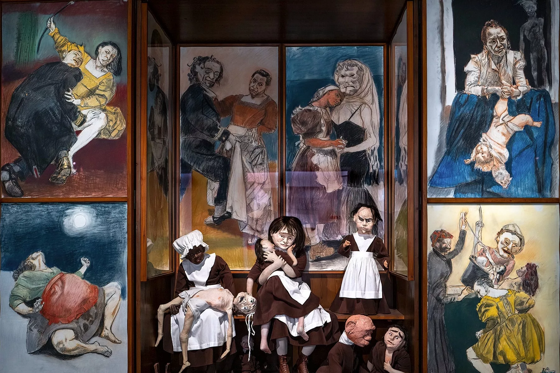 Незадолго до своей смерти совсем уже больной Уиллинг посоветует ей заняться инсталляциями, используя для этого старые куклы времен их детства. Из них Паула соберет свою знаменитую «Ораторию» — огромный алтарь, в котором иконописные лики католических мадонн с младенцами заменит историями рождения и гибели молодых женщины. По ним можно проследить весь их жизненный путь, состоящий из одних бесконечных издевательств и мучений. С младенчества и до последнего вздоха. Куклы Регу – дряблые, рыхлые, страшные. Понятно, что эти жертвы насилия когда-нибудь повзрослеют и, если выживут, сами займут места своих мучителей. А пока все, что остается – это бессильно положить голову на грудь Смерти и слиться с ней в медленном танце.