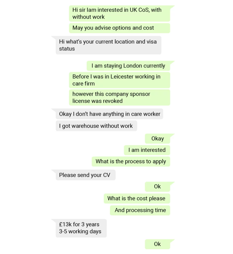 The Times провела расследование рынка фиктивных рабочих мест. Схема простая: за £13 000 посредник помогает оформить CoS (сертификат спонсорства), который позволяет подать заявление на визу Skilled Worker. На бумаге всё выглядит законно: есть даже банковские выписки и платежные ведомости, подтверждающие необходимый для визы доход.