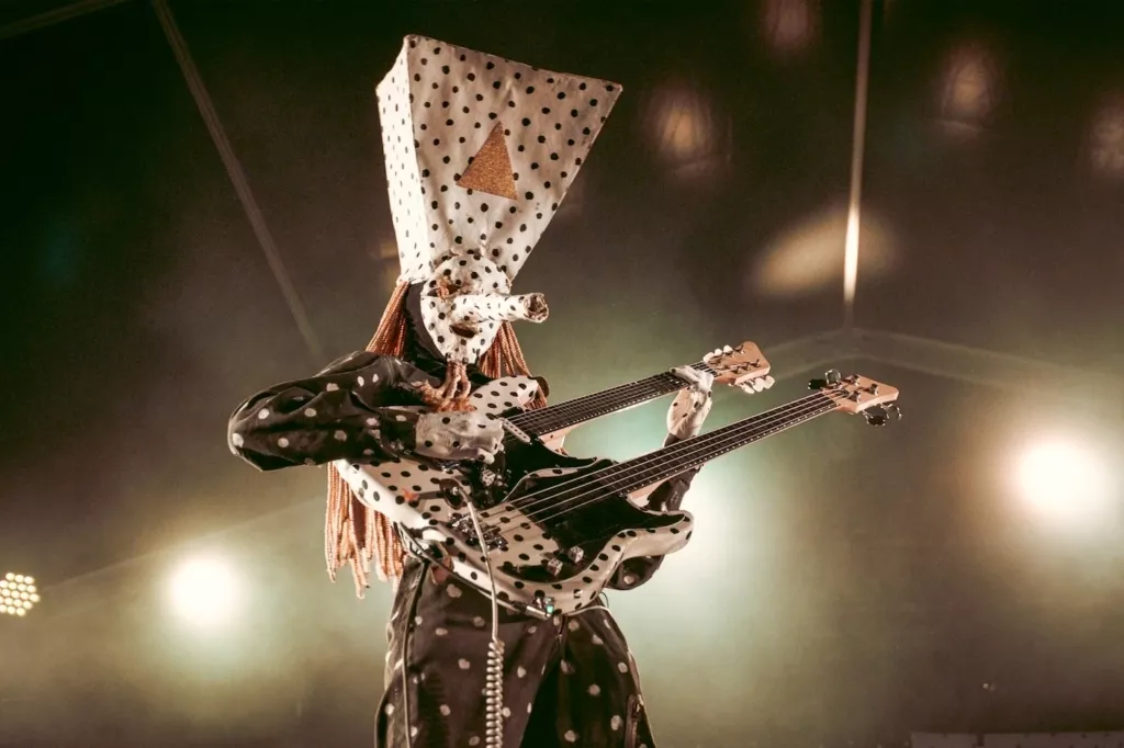 Если кто и успел удивить публику по-настоящему в 2026 году, то это канадский дуэт Angine De Poitrine. Сложно представить на сегодняшней сцене нечто более странное. Это двое музыкантов в черно-белых одеяниях в крупный горох в стиле Андрея Бартенева. Исполнители скрывают лица под громоздкими колпаками, так что невозможно даже определить их пол, тем более что называют они себя “Khn” и “Klek”. Один сидит за барабанами, другой (или другая) играет на двухгрифовом инструменте, объединяющем в себе микротональную электрогитару и бас, причем, звук закольцован при помощи сэмплеров. Самое общее определение их стиля —math-рок, то есть, математически выверенная музыка со сложными изменениями ритма. На сайте же Angine De Poitrine дано такое определение: mantra-rock dada pythago-cubiste. При всей сложности концепта концерты Angine De Poitrine — чистый отвяз. Зрители веселятся как дети и уже успели выучить фирменное танцевальное движение музыкантов — «волна» из рук, напоминающая о танце маленьких лебедей в известном балете.