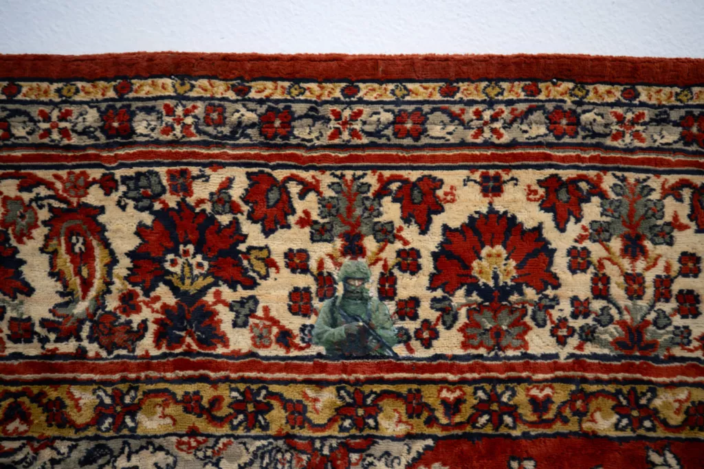 Ковер на стене, центральный объект гостиной, обычно воспринимается как знак уюта и не привлекает особого внимания. Но если присмотреться, в орнаменте начинают проявляться фигуры военных, «зеленые человечки». Павел загрунтовал несколько фрагментов ковра и дописал поверх фигурки солдат. Художник рассказывает, что это версия его ранней работы 2015 года. После событий 2014 года ему показалось, что «маленькие зеленые человечки» как будто всегда уже находились внутри старых пыльных ковров, словно скрывались там с детства. Во время разговора он несколько раз обращается к понятию «жуткое». Не случайно эту работу он назвал Unheimlich (2024), отсылая к фрейдовскому тексту о феномене «жуткого», возникающем не из неизвестного, а из слишком знакомого.