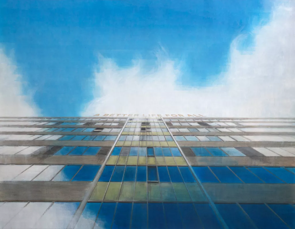 В новых работах продолжается разговор, понятный и британскому зрителю, о конкретной истории социального жилья и послевоенных надежд. Но важно и другое: Отдельнов подходит к этой теме не как внешний наблюдатель, а из собственного опыта постсоветского пространства, рассматривая ее в более широком контексте. С этим перекликается и его проект «Русское нигде» (2020) – пейзажи без точного адреса, но с универсальной узнаваемостью. Тогда же появилась работа «Жутен» (2020), слово из сетевой субкультуры, ставшее точным обозначением постсоветской повседневной хтони. Лондонское социальное жилье он с иронией называет «тем же самым», не буквально, а по ощущению.