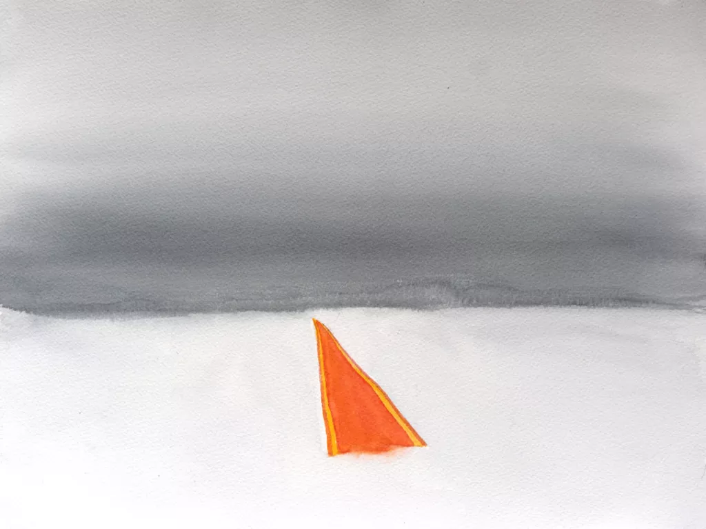 В Лондон Павел приехал из Швеции, куда был приглашен на выставку. Война застала их семью в Уппсале, по словам Веры, «затерявшимися среди снегов», в состоянии неопределенности. Там появился цикл акварелей со снежным полем для выставки «Русское поле экспериментов». В этом снежном поле предметы выглядят особенно одинокими. Красная ковровая дорожка, флаг, блокпосты – все кажется конкретным и немного оторванным от реальности. Здесь ощущается влияние русского авангарда, но не как цитаты, а как языка. Красное на белом, геометрия, знак, — все это не ведет в будущее.