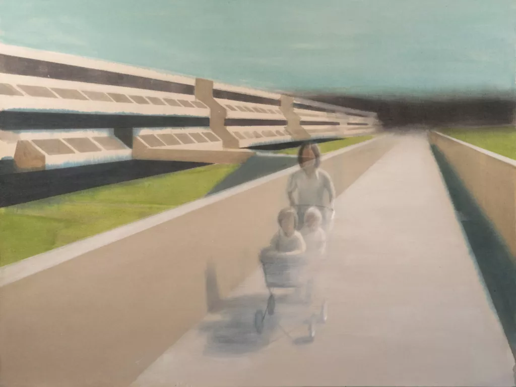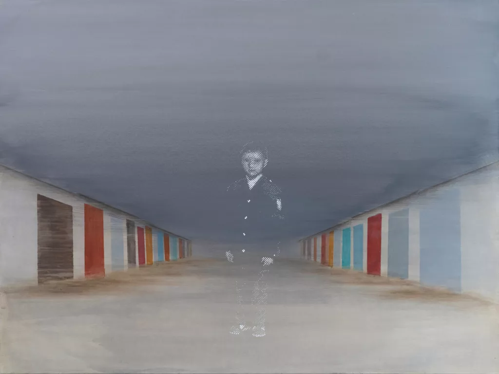 В некоторых новых работах появляется белая полоса как отражение на стекле, как будто мы смотрим через окно движущегося автобуса. Когда я говорю, что она воспринимается знаком дистанции, художник соглашается: «двойной посторонний и для той реальности, и для этой». Эта дистанция для него важна: она позволяет видеть яснее. Это касается не только эмигрантского опыта, дистанция меняет взгляд на прошлое и на детство. Говоря о России, он упоминает культурные «слои», небольшие анклавы, в которых сейчас существует художественная и интеллектуальная жизнь. Дистанция позволяет увидеть и их хрупкость, и необходимость.