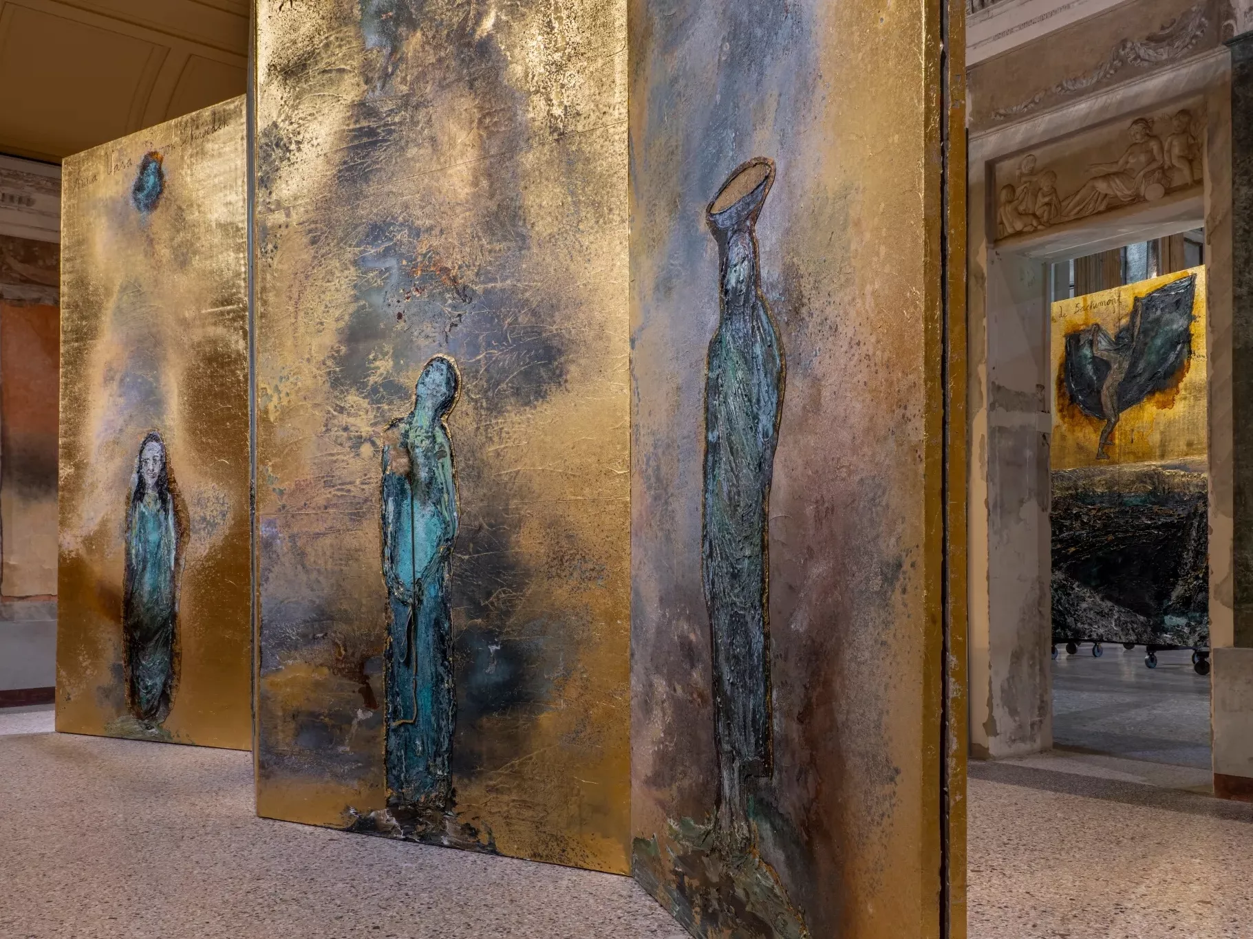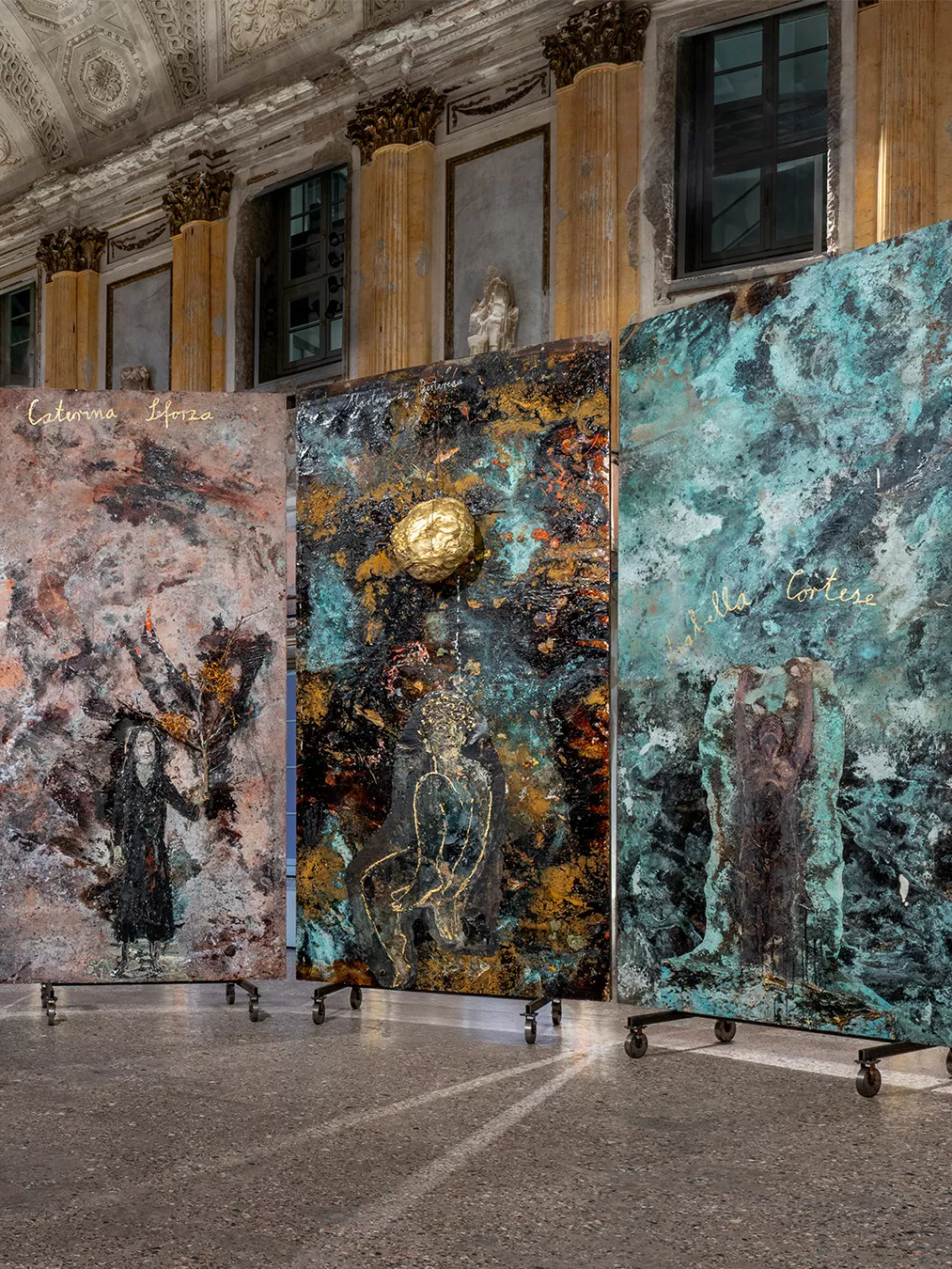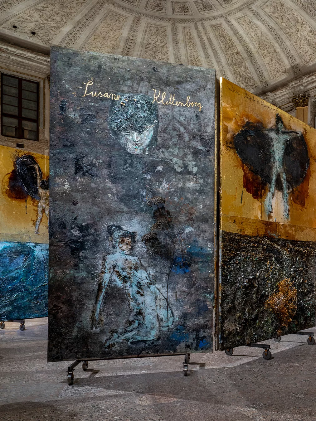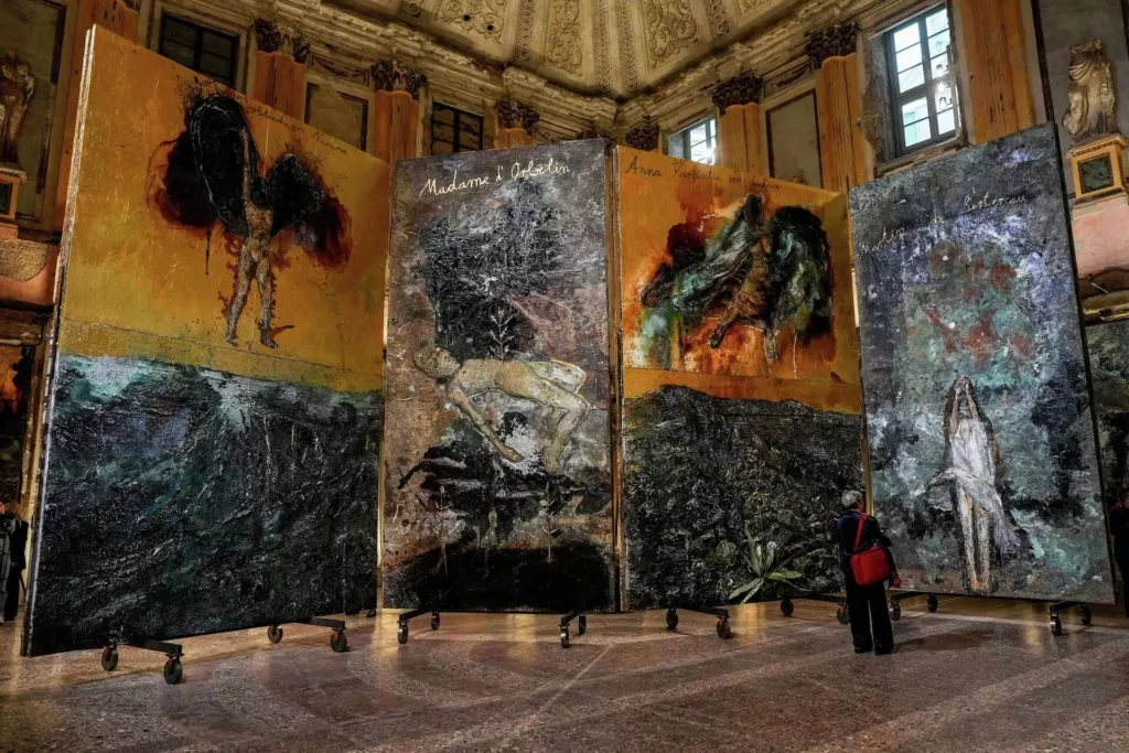 В общем, именно эти женщины, известные и почти забытые, стали героинями выставки Кифера «Алхимички», которая идет до конца сентября в Королевском дворце в Милане. Огромные полотна мастера выставлены в «Зале кариатид», который хранит память о разрушении после бомбардировок 1943 года.