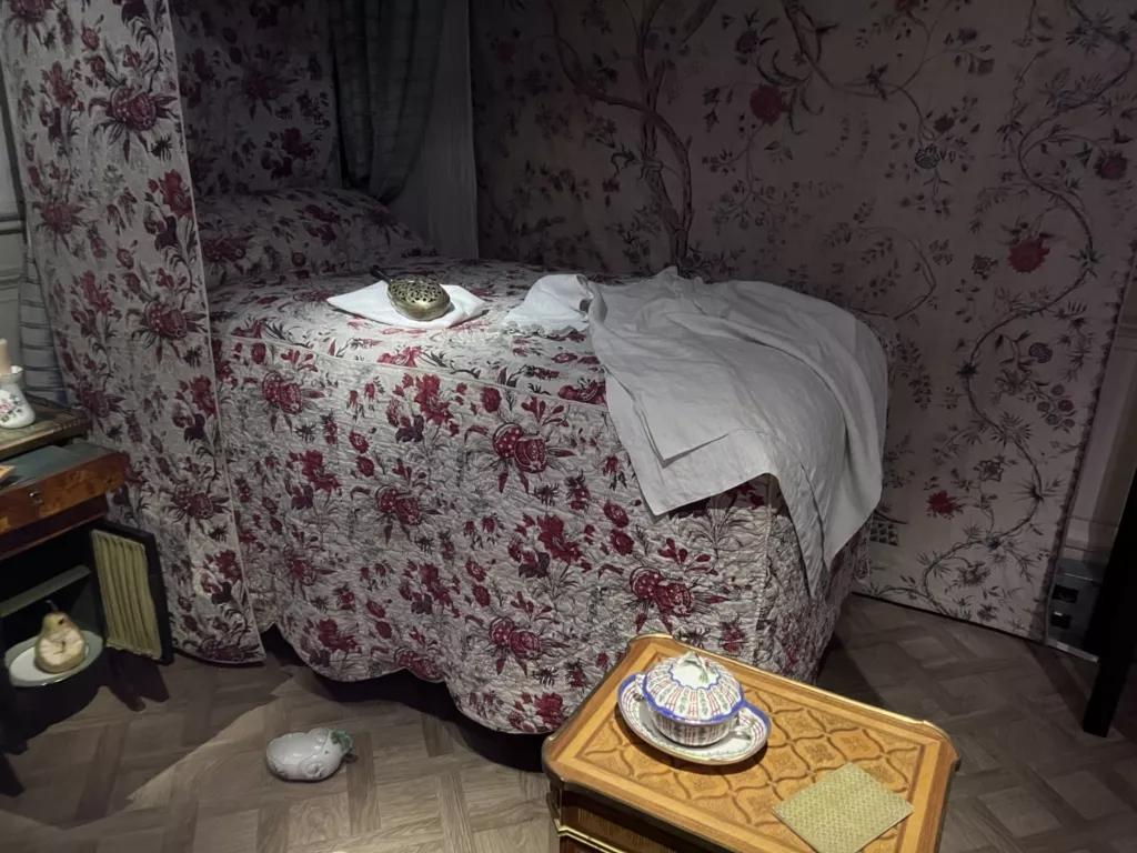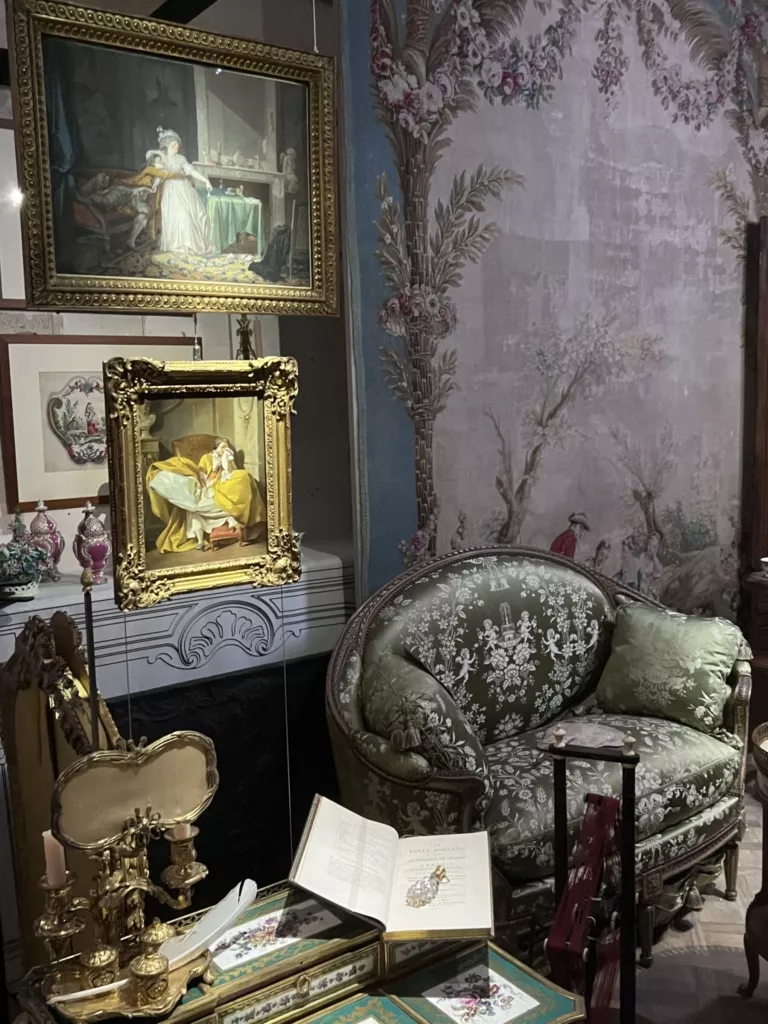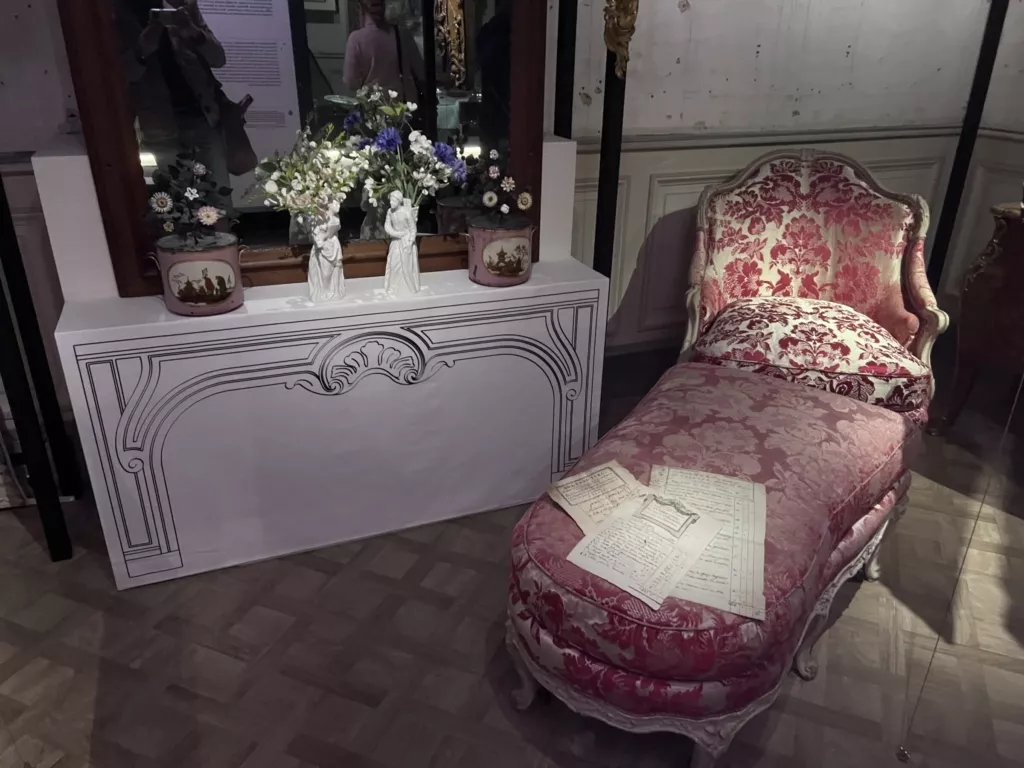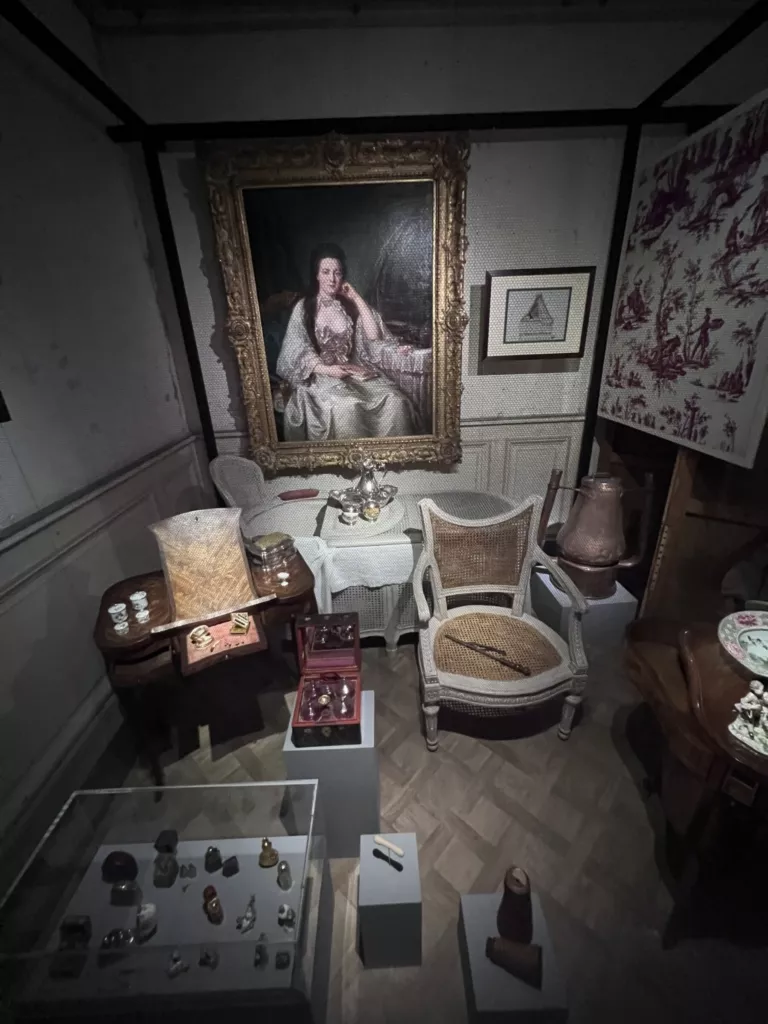 Эта удивительная выставка придумана как полное, с головой, погружение в прошлое. Она адресована всем чувствам сразу. Зрению — благодаря отличному выбору картин и гравюр, мебели, статуэток, табакерок, мушечниц, письменных приборов, книг, ночных горшков. Слуху – потому что фоном идут звуки старого Парижа, как будто бы доносящиеся с улицы. И наконец, обонянию – ароматы XVIII века были воссозданы по историческим рецептам, и теперь мы можем вдохнуть запах времени, сладкую смесь пыли, розы и патоки. Это возможность час за часом прожить один день парижской аристократической семьи 1780-х годов. Ну что же – давайте попробуем. Напишем вместе несколько страничек из дневника хозяина дома: