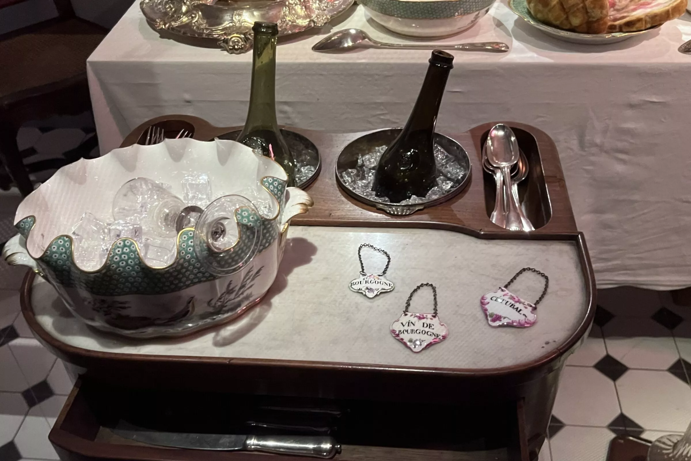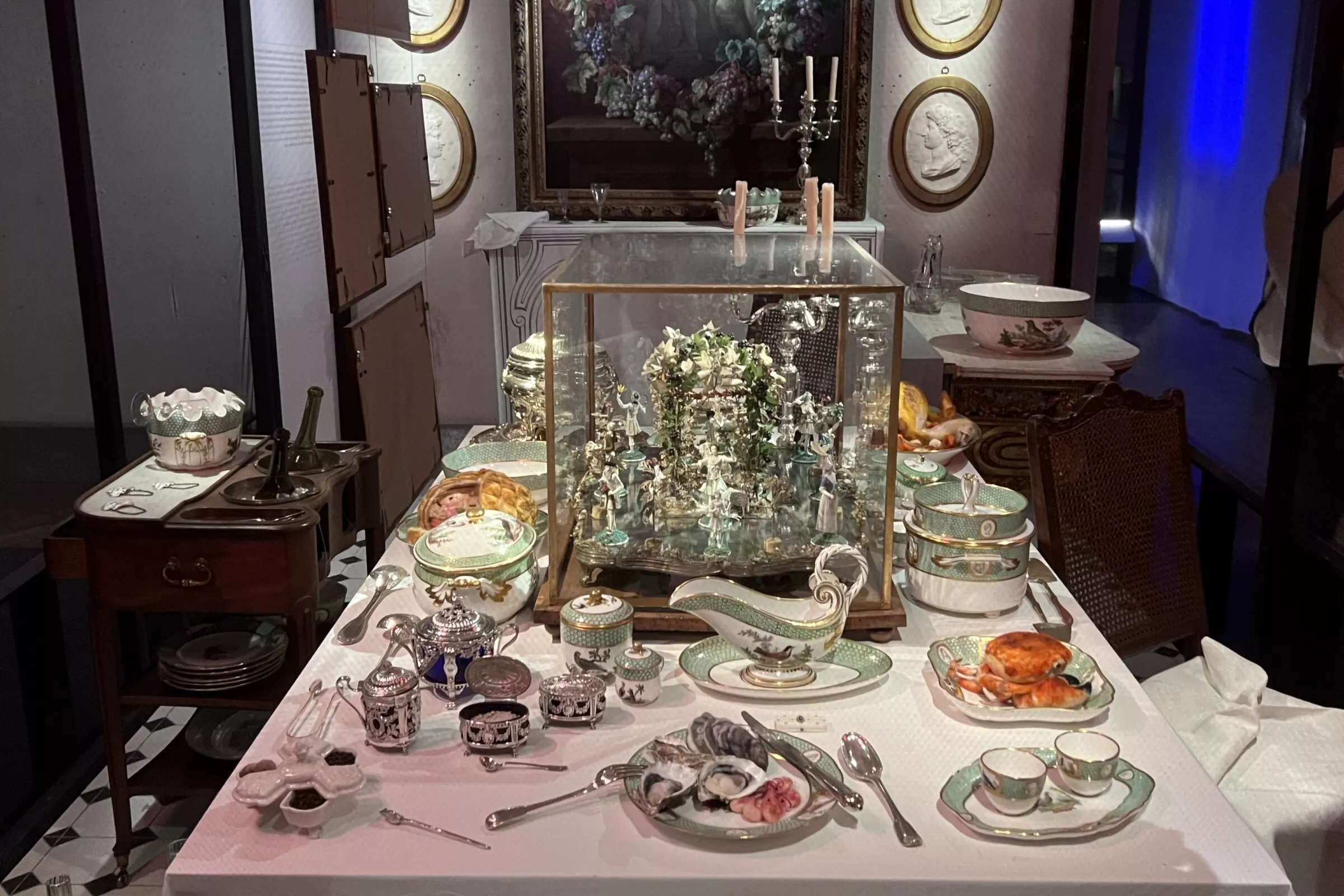 Перед трапезой мы омываем руки у настенного фонтана — жест столь же гигиенический, сколь и изящный. Стол накрыт с тем вниманием к деталям, которое составляет гордость хозяйки дома. Вот наполненные льдом ведёрки для бутылок, на груди которых, как ордена, висят фарфоровые этикетки: красное, шампанское, сладкое вино. Украшения для центра стола, развлекающие нас в промежутках между блюдами, — как будто маленький фарфоровый театр, подсказывающий темы для застольных бесед.